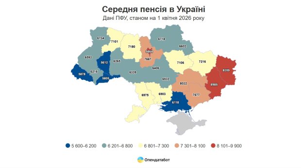 Найвищі пенсії традиційно у Києві — в середньому, 9 864 гривні. Найнижчі — на Тернопільщині, де середня виплата становить 5 612 гривень. Загалом лише у 8 регіонах пенсії дотягують до середнього рівня або перевищують його.