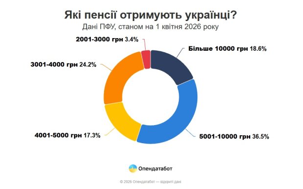 Водночас поступово зменшується частка пенсіонерів із виплатами від 4 до 5 тисяч гривень. Наразі це 1,74 мільйона людей, або 17%, тоді як рік тому їх було близько 20%. Середня пенсія тут — приблизно 4,5 тисячі гривень.