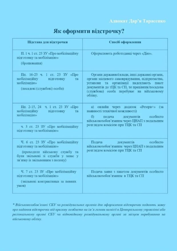 Отдельно адвокат обращает внимание на специфику для военнообязанных СБУ и разведывательных органов: они подают заявления не в ТЦК, а в соответствующие органы по месту нахождения на учете.